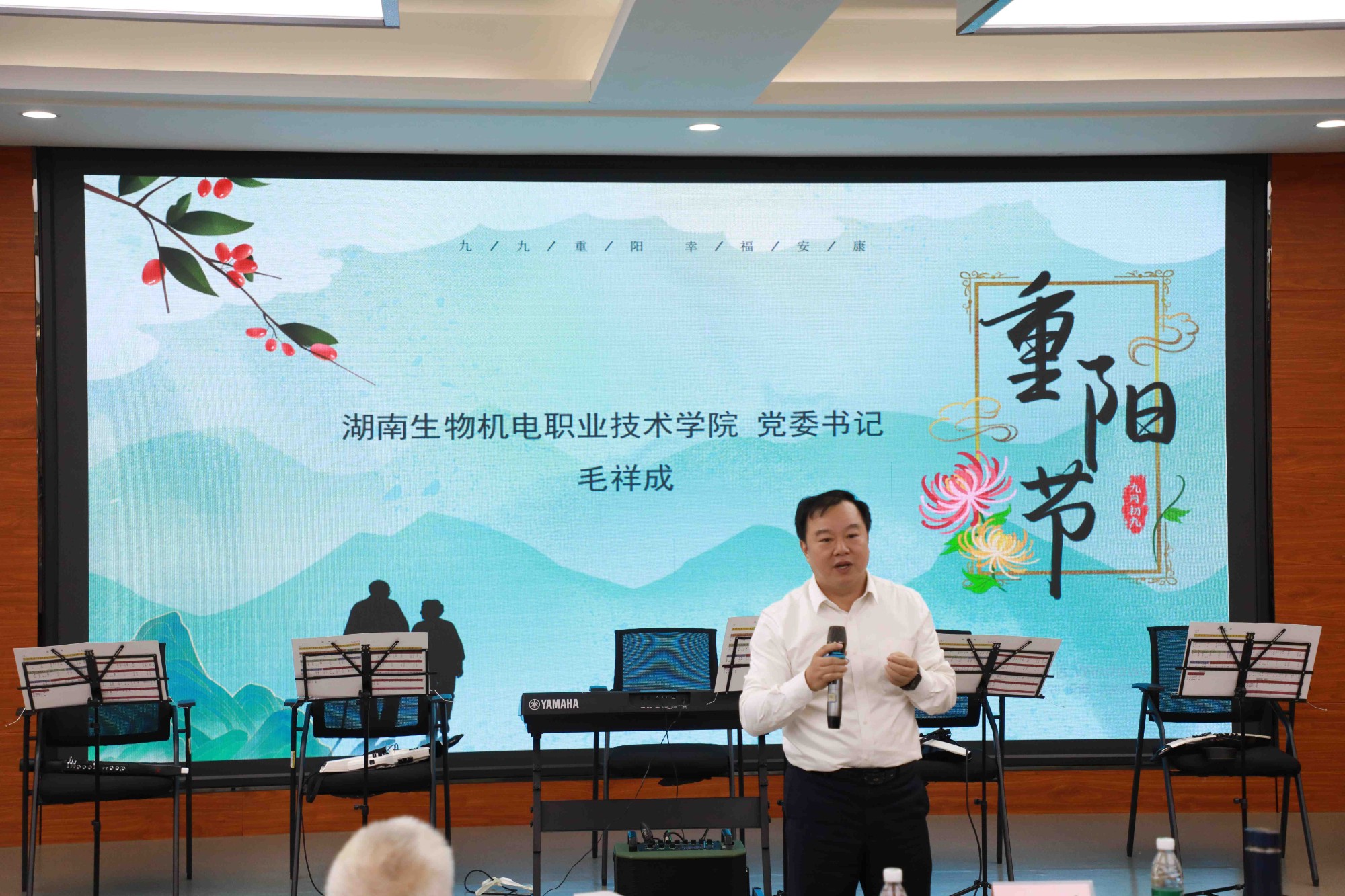 天朗气清,金桂涵芳。2025年10月28日,在中华民族传统敬老节日—重阳节来临之际,主题为“凝聚银发力量,共享幸福生活”的湖南省教育厅机关离退休同志2025年重阳节主题活动在学校北山基地隆重举行。湖南省教育厅党组书记、厅长高山,二级巡视员王玲,湖南生物机电职业技术学院党委书记毛祥成,党委委员、副校长黄全胜等领导出席,与教育厅机关离退休老同志欢聚一堂、共庆佳节。