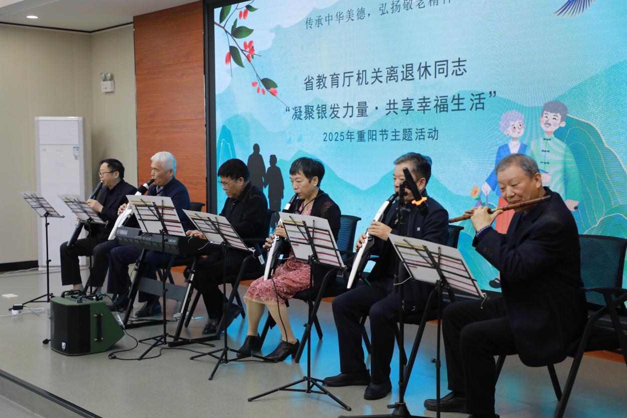 省教育厅离退休老同志与湖南生物机电职业技术学院师生代表联袂奉献了一场精彩纷呈的文艺汇演。演出节目形式多样、内容丰富,涵盖了乐器合奏、舞蹈表演、茶艺展示、花艺创作、诗歌朗诵以及气势恢宏的大合唱等。整场演出充分展现了离退休同志老有所乐、老有所为、积极向上的精神风貌,也体现了学校师生精湛的文化艺术素养与昂扬风采。活动现场还穿插了敬茶、献花等趣味性互动节目,吸引了众多离退休同志的踊跃参与,现场气氛热烈,欢声笑语不断。