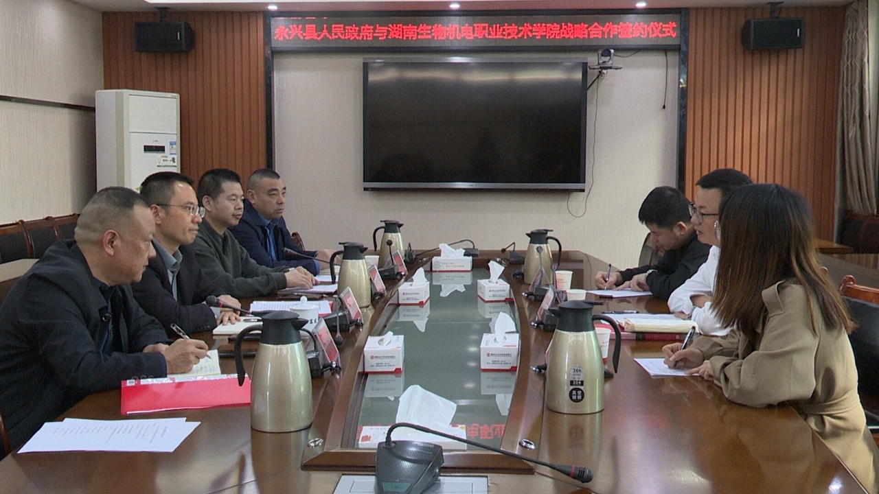 2025年11月6日,永兴县人民政府与湖南生物机电职业技术学院战略合作签约仪式在永兴县人民政府举行。学校副校长何荣誉和永兴县副县长李立彪、政府办副主任张爱国、农业农村局党组书记刘勇、产业发展服务中心主任尹家令等领导出席。