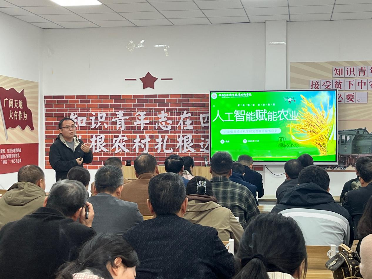 11月10日,况威为茶铺茶场管理区全体机关干部、村(社区)干部、企业及合作社负责人等近70人,作“人工智能赋能农业”专题培训讲座。他从我国农业面临的耕地退化、劳动力老龄化、面源污染等现实问题出发,结合国家《加快建设农业强国规划(2024—2035年)》和“人工智能+”行动政策背景,阐述了智慧农业的内涵与发展路径。重点演示了智能种植决策、智慧畜牧管理、农产品智能分级、农业气象防控、农村电商运营与碳资产管理六大应用场景,并结合实际案例阐释了AI技术在提升生产效率、优化资源配置方面的成效。