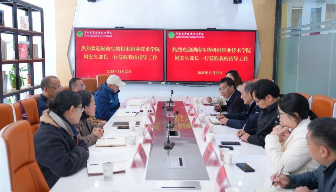 11月27日,调研组赴云南农业职业技术学院交流。该校党委副书记孙继先介绍学校办学历史、办学特色及近年党建、专业建设、人才培养成效;结合实际,分享全国样板党支部创建经验、党建引领与业务深度融合路径、党员先锋模范作用发挥举措、畜牧兽医专业群建设特色做法。周宏久介绍我校党建品牌创建、国家"双高计划"专业群建设的特色亮点与阶段性成果,成志军和刘鹤翔分别就我校纪检监察工作、畜牧兽医专业群建设方面开展交流。双方聚焦党建引领育人机制创新、畜牧兽医专业课程体系优化、实训基地共建共享、技术技能人才联合培养等核心问题深入交流,就搭建校际合作平台、推进教学资源互通、联合开展教研活动等事项达成初步合作意愿。